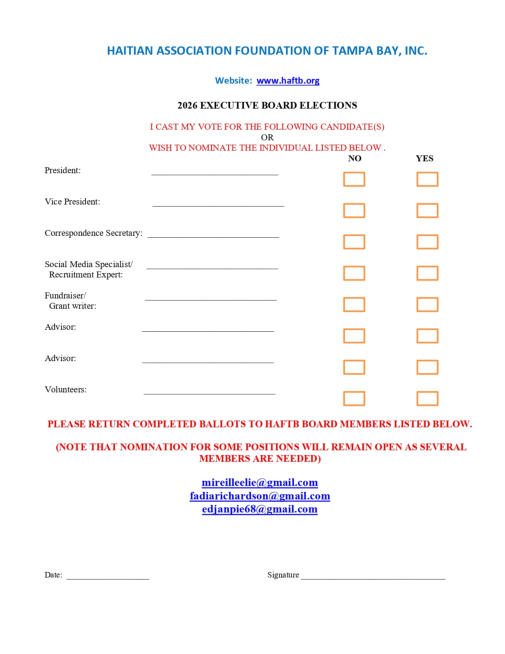 Mailing Address: Haitian Association Foundation of Tampa Bay, Inc.P.O. Box 5Wimauma, FL. 33598