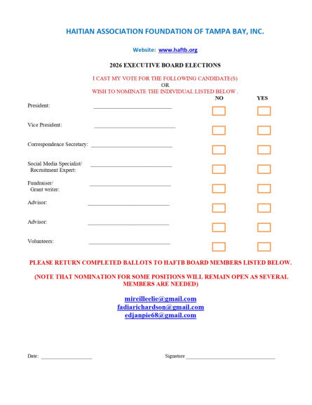 Mailing Address: Haitian Association Foundation of Tampa Bay, Inc.P.O. Box 5Wimauma, FL. 33598